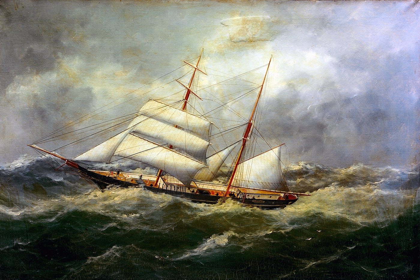 When the Dei Gratia first sighted her, the Mary Celeste was sailing on the starboard tack under jib and fore staysail and the wind was blowing from the north. Meanwhile, the Dei Gratia was progressing on the opposite tack under a more conventional press of canvas. Intrigued by how the brigantine lurched through the water, several hands were sent across from the Dei Gratia to investigate. They found that there was not a soul aboard the brigantine, nor was there any obvious cause for her abandonment.