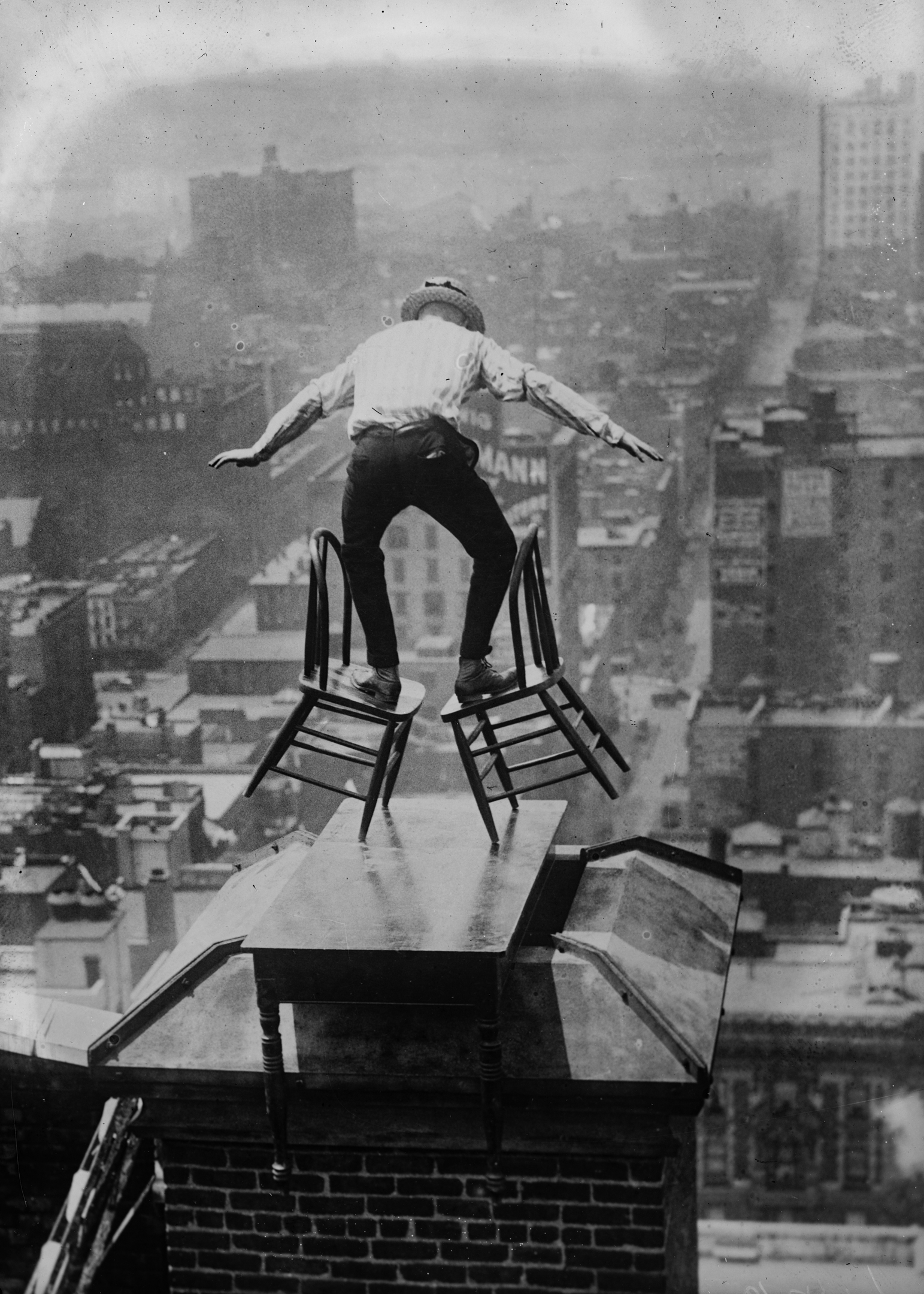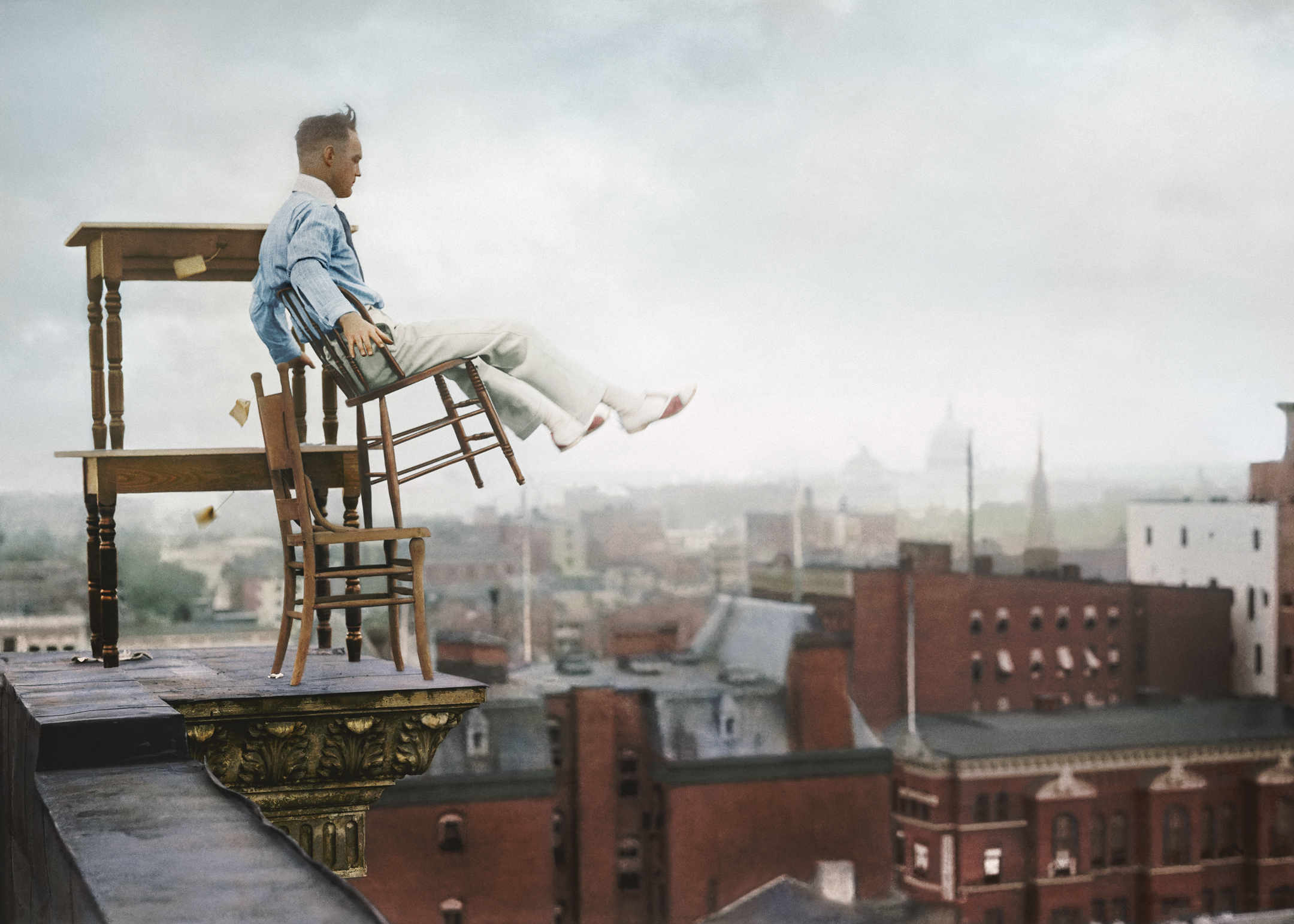 Next came a couple of chairs. Reynolds placed the hind legs of one upon the seat of the other and then he climbed to the top. Sliding onto the seat, he stretched out his hands and legs to gain a balance. His hair flapped in the breeze.