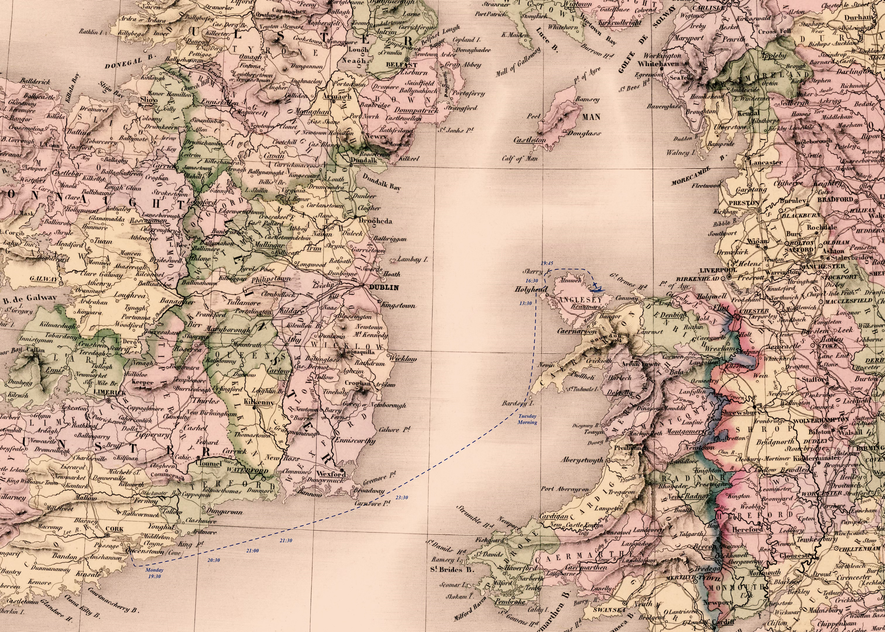 Having left Queenstown on Monday afternoon, Suica worked his watches over the next day. Off the port beam ran the green Irish coast with its familiar run of lighthouses – the Ballycotton, the Youghal, the Tuskar Rock – before the Royal Charter began its crossing the Irish Sea.